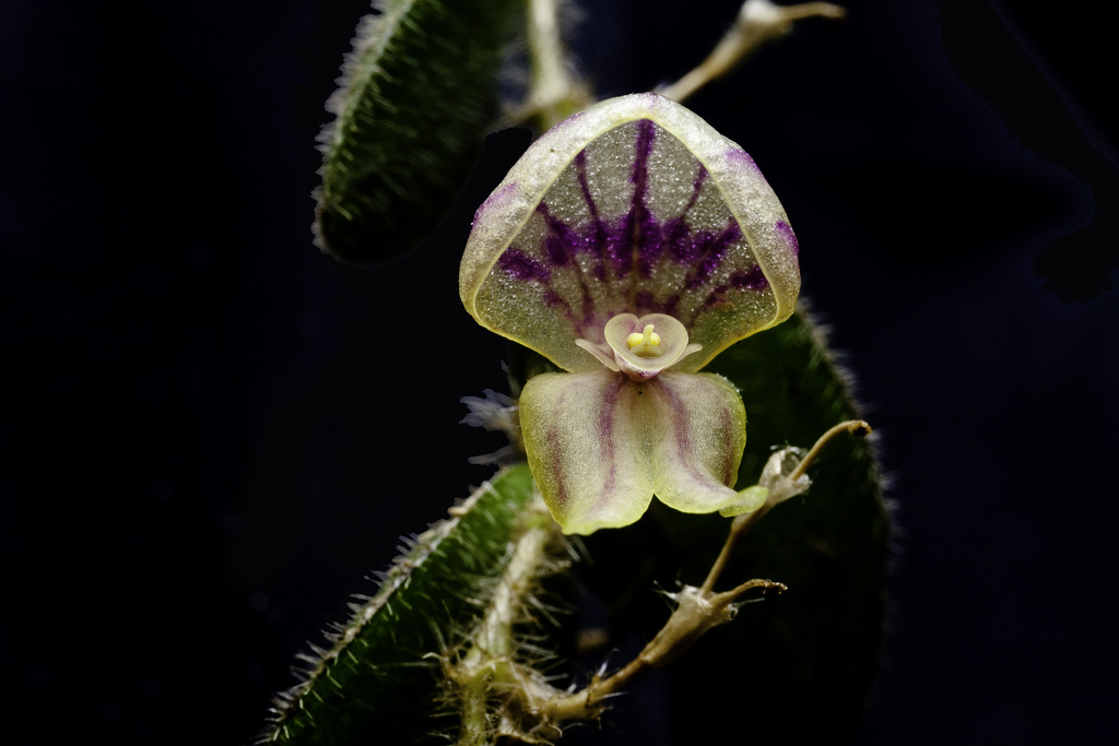 Found in Ecuador without locality as a miniature to small sized epiphyte with a pendant chain of coriaceous, densely pilose, elliptic, obtuse, 5 veined, contracted below into the base leaves that blooms in the summer on a .6 to 1" [1.5 to 2.5 cm] long, , ascending, successively single flowered inflorescence arising laterally from the ramicaul and has a ciliate floral bract