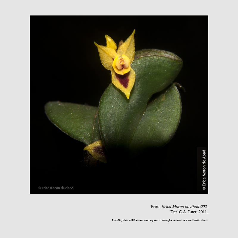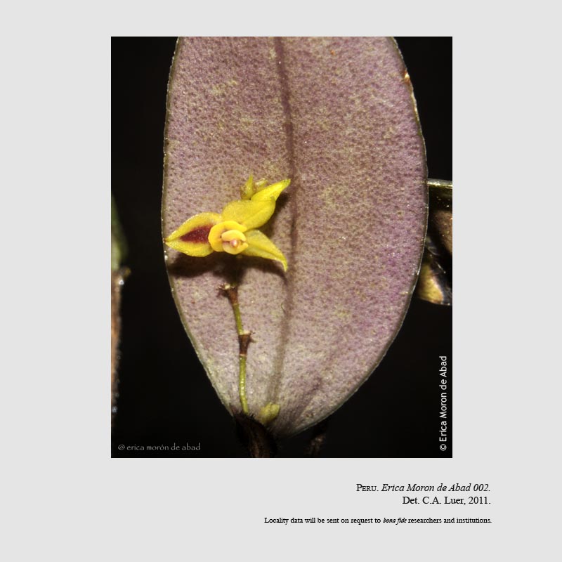 Found in Peru in cloud forests at elevations around 2900 meters a mini-miniature sized, cold growing epiphyte with slender, erect ramicauls enveloped by ribbed, minutely scabrous, lepanthiform sheaths and carrying a single, apical, suberect, coriaceous, purple suffused beneath, ellitpical, subacute, cuneate below into the petiolate base leaf that blooms in the early winter on 2 to 3, congested, distichous, .8" [ to 2 cm] long including the .2" [5 mm] long peduncle, successively single, many flowered inflorescence arising on the back of the leaf.
