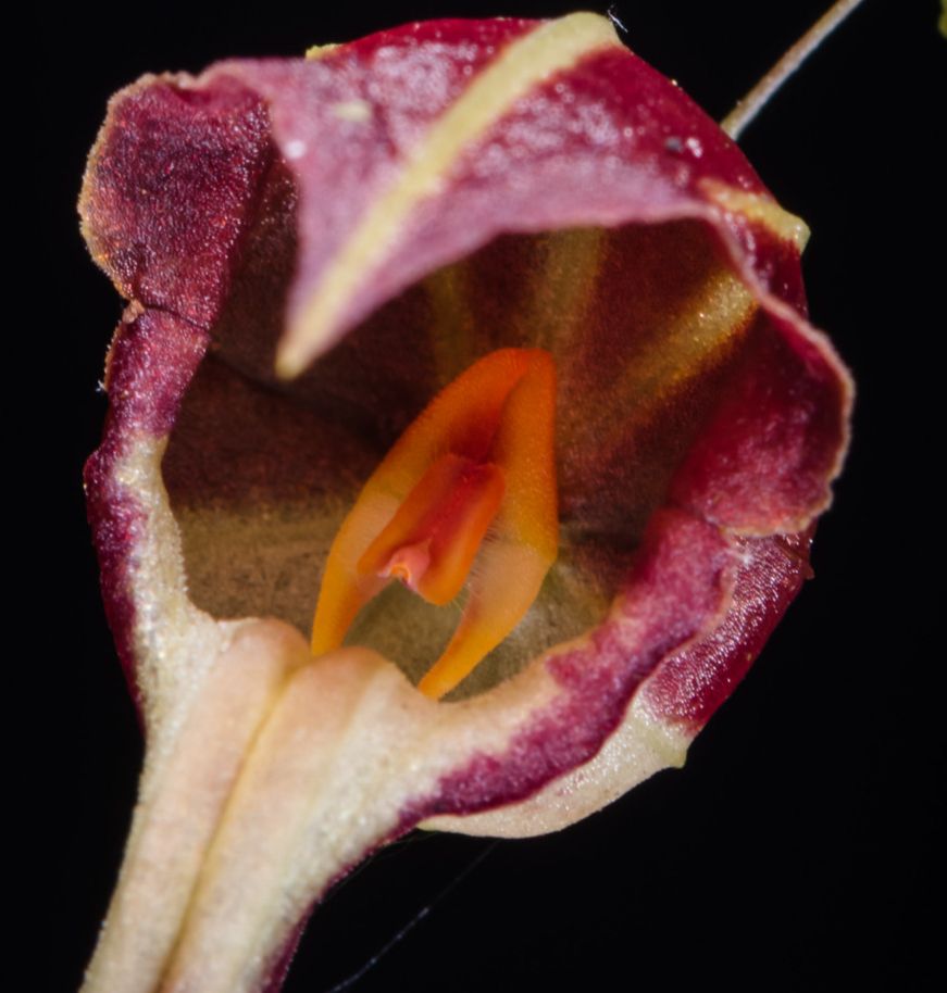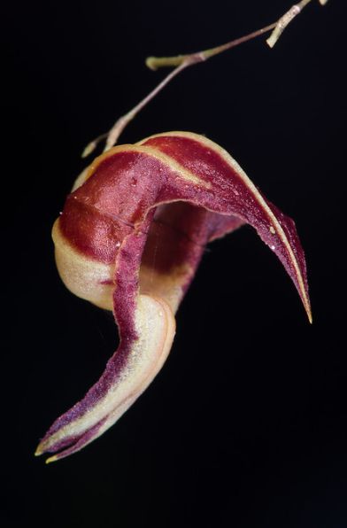Found in Cundinamarca department of Colombia without locational data as a mini-miniature sized epiphyte with slender, erect ramicauls enveloped by 3 to 5, minutely ciliate, lepanthiform sheaths and carrying a single, apical, erect, coriaceous, ovate, acute, rounded and contracted below into the petiolate base leaf that blooms in the spring on a filiform, loose, arching then pendent, 2.4 to 2.6" [6 to 6.5 cm] long including the 1.2 to 1.4" [3 to 3.5 cm] long peduncle, successively single, few flowered inflorescence.