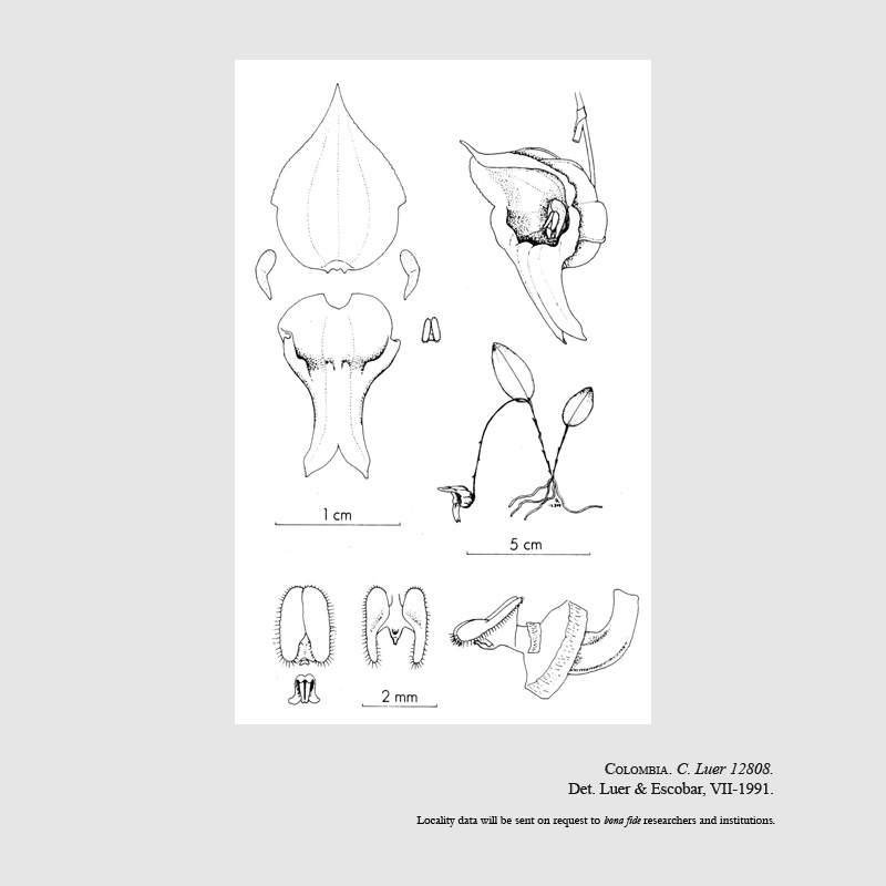 References W3 Tropicos, Kew Monocot list , IPNI ; * Orquideología 18(1): 44 Luer & Escobar 1991 drawing fide; Icones Pleurothallidinarum Vol XXXII Luer 2012 drawing fide; Orchids A Colombian Treasure Vol 3 Ortiz & Uribe 2019 drawing/photo fide;
