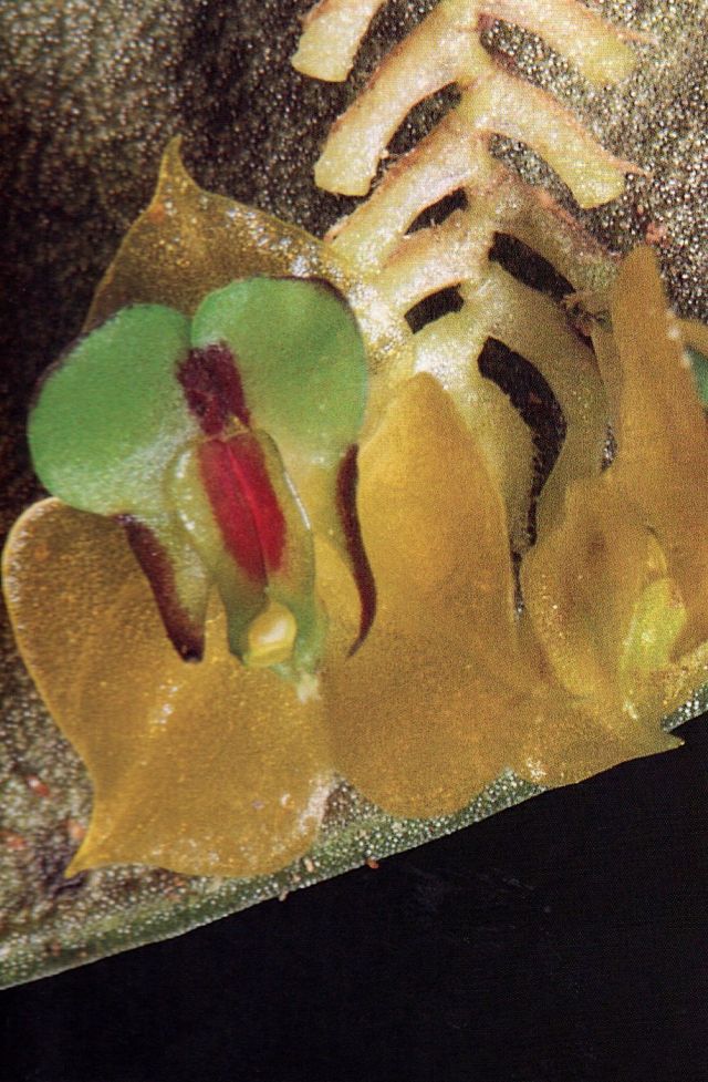 Found in Esmeraldas province Ecuador in wet montane cloud forests at elevations around 750 meters as a mini-miniature sized, warm growing epiphyte with erect, slender ramicauls enveloped basally by 5 to 7 microscopically ciliate, lepanthiform sheaths and carries a single, apical, erect, coriaceous, ovate, acute, cuneate and contracted below into the petiolate base leaf that have a purple hue on the underside and blooms on a dense, distichous, 1.2" [3 cm] long, successively many flowered, racmose inflorescence that is shorter than the leaf and arising on the underside of the leaf.