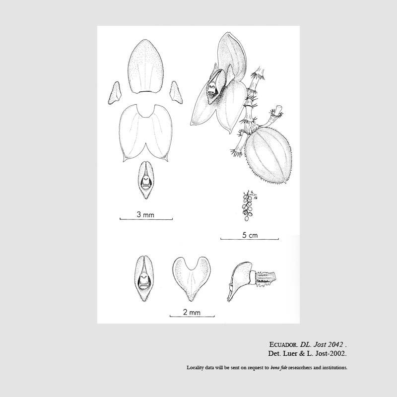 Found in Ecuador in cloud forests at elevations around 1890 meters as a mini-miniature sized, cool growing epiphyte with pendant, repent, slender rhizomes giving rise to prone ramicauls concealed by a long-ciliate lepanthiform sheath and carrying a single, apical, pendent, coriaceous, lentiform, minutely short-ciliate, broadly elliptical, obtuse, 3 veined, contracted below into the petiolate base leaf that blooms in the spring on an ascending, .04" [1mm] long, single flowered inflorescence witha long-ciliate floral bract