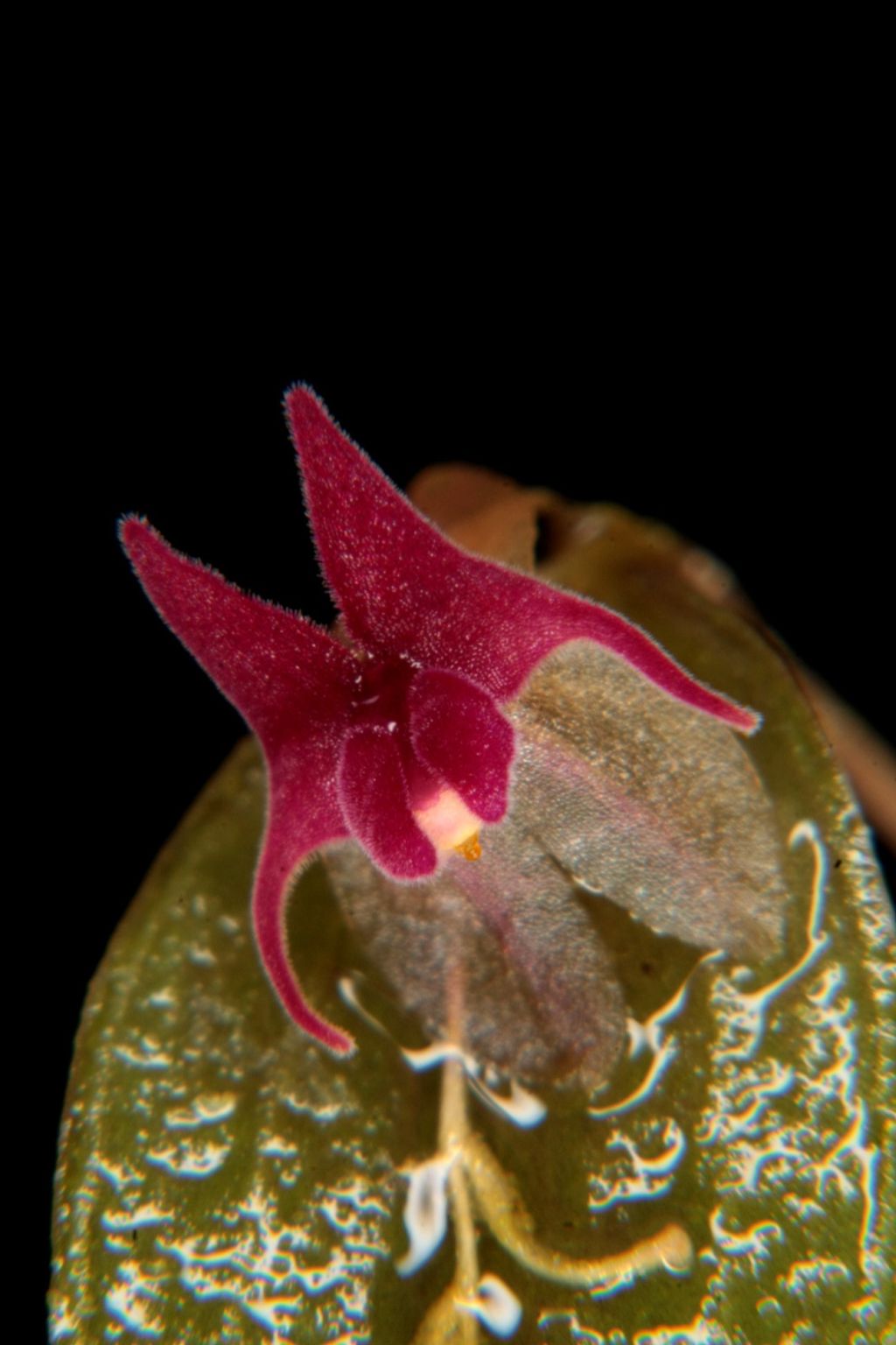 Found in Esmeraldas province of Ecuador at elevations around 750 to 800 meters as a mini-miniature sized, warm growing epiphyte with a slender, erect ramicaul enveloped by 5 to 7, minutely ciliate lepanthiform sheaths and carrying a single, apical, spreading, coriaceous, purplish, elliptical, acute, cuneate and contracted below into the petiolate base leaf that blooms in the early summer and again in the winter on a filiform, congested, .24" [6 mm] long, successively several flowered inflorescence arising on the top of the leaf.