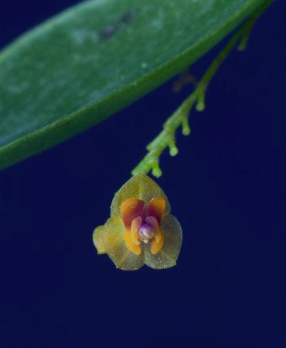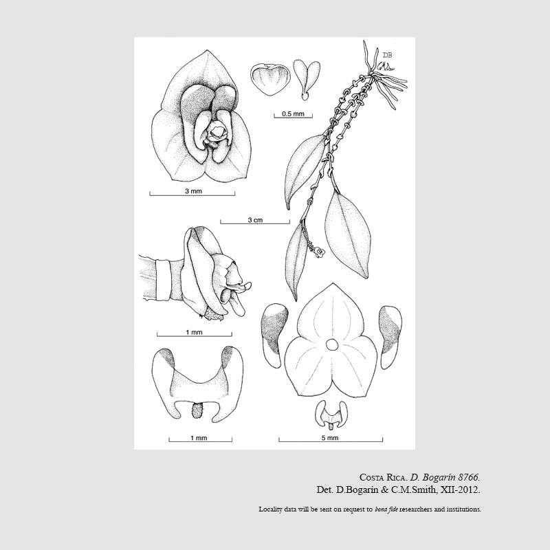 Found in Puntarenas province of Costa Rica at elevations around 800 meters as a mini-miniature sized, warm growing epiphyte with more or less descending ramicauls enveloped by 6 to 12, lightly ciliate [especially on new growths] lepanthiform sheaths with the ciliate ostia markedly dilated and carrying a single, coriaceous, green, elliptic, subobovate, acuminate with a short apiculus, cuneate and narrowing below into the petiolate nase leaf that blooms in the spring on a racemose, distichous, arising on either side of the leaf, shorter than the leaf, peduncle .68" [1.7 cm] long, .8" [2 cm] long overall, rachis .16 to .2" [4 to 5 mm] long, successively single flowered inflorescence with lightly ciliate, as long as the ovary floral bracts.