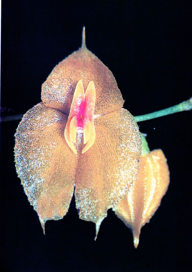 Found in southeastern Ecuador in cloud forests at elevations around 2700 meters as a mini-miniature sized, cold growing epiphyte with a slender, erect ramicaul enveloped by 3 to 4, minutely ciliate lepanthiform sheaths and carrying a single, apical, erect, coriaceous, elliptical-ovate, obtuse, cuneate and contracted below into the petiolate base leaf that blooms in the later summer and early fall on a filiform, loose, distichous, lightly flexuous, to 3.8" [to 9.5 cm] long, successively single, several flowered inflorescence.