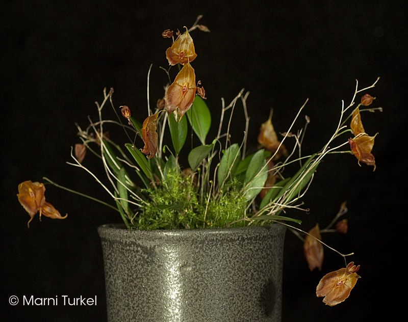 Found in Antioquia department of Colombia at elevations around 2500 meters as a mini-miniature sized, cold growing epiphyte with slender, erect ramicauls enveloped by 4, microscopically ciliate-scabrous lepanthiform sheaths and carrying a single, apical, erect, coriaceous, obovate, obtuse to rounded and cuneate below into the petiolate base leaf that blooms in the winter on a slender, erect, loose, 1" [2.5 cm] long including the .6" [1.5 cm] long peduncle, successively single, few flowered inflorescence that carry the flowers beyond the leaf.
