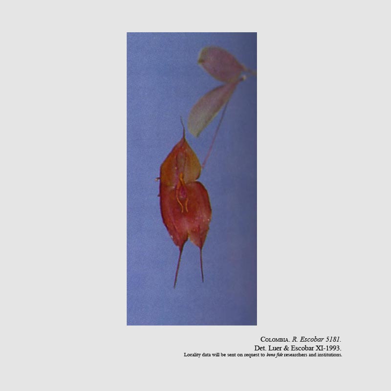 References W3 Tropicos, Kew Monocot list , IPNI ; *Orquideología 19(1): 25-27 Luer & Escobar 1993 drawing fide; Native Colombian Orchids Vol 5 COS 1994 photo fide; Icones Pleurothallidinarum Vol XXXII Luer 2012 drawing fide; Orchids A Colombian Treasure Vol 3 Ortiz & Uribe 2019 drawing/photo fide;