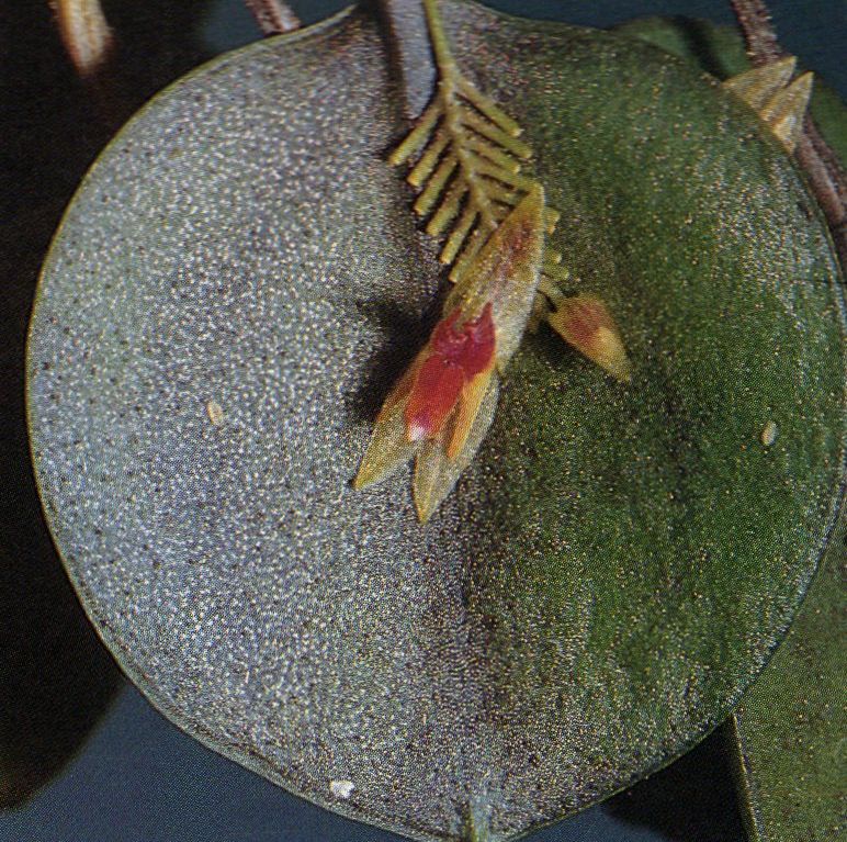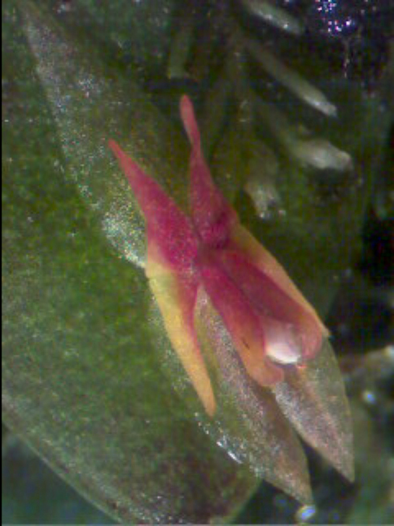 Found in Antioquia, Norte de Santander, Arauca and Meta departments of Colombia at elevations around 1700 to 2150 meters as a mini-miniature sized, cool to cold growing epiphyte with slender, erect ramicauls enveloped by 4 to 6, close, minutely ciliate, lepanthiform sheaths and carrying a single, apical, erect, coriaceous, purple suffused beneath, broadly ovate to cordate-obtuse to rounded apically, broadly cuneate to cordate, contacted into the petiolate base leaf that blooms in the spring on a dense, distichous, .4" [1 cm] long including the .16 to .2" [4 to 5 mm] long peduncle, successively many flowered inflorescence arising from behind the leaf.