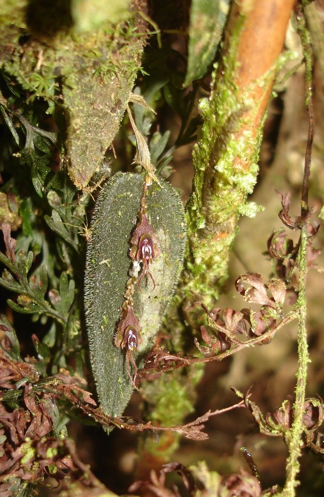 Found in Valle de Cauca department of Colombia in cloud forests at elevations below 2000 meters as a mini-miniature sized, cool to cold, pendent growing epiphtye with a ramicaul enveloped by 5 to 7, apically enlarged, trumpet-like, ciliate ribbed and margins, lepanthiform sheaths and carrying a single, pendent, greyish green, coriaceous, ovate-oblong, densely spiculate-pubescent, marginally densely cilate, apically apiculate, rounded below into the sessile base leaf that blooms in the late summer and earlier fall on 1 to 2 simultaneous, slender, congested, [1.05 to 1.7 cm] long including the .02 to .08" [.05 to 2 mm] long peduncle, successively several to many flowered inflorescence