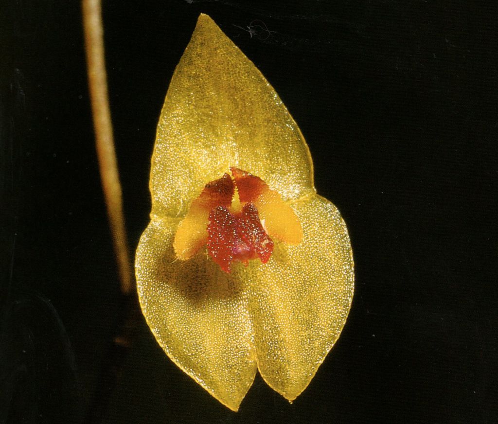 Found in Cuba as a mini-miniature sized, caespitose, cool growing lithophyte or occasional epiphyte with erect, slender ramicauls enveloped by up to 5, cornucopiate, marginate, acuminate, , glabrous to muriculate leapanthiform sheaths and carrying a single, apical, elliptic to obovate, fleshy, purple beneath, acute, tridenticulate, narrowing below into the sessile base leaf that blooms at most any time of the year on a terminal, arising on the adaxial side of the leaf, filiform, fractiflex, 1.6 to 2.8" [4 to 7 cm] long, much longer than the leaf, distally distichously, successively 2 to 3, several flowered inflorescence.