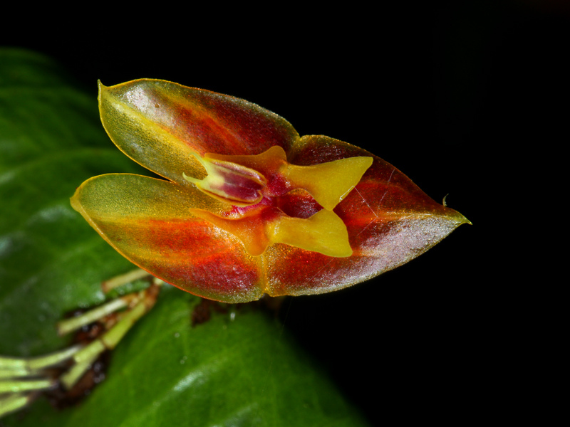 Found in Choco and Valle de Cauca departments of Colombia at elevations around 2000 meters as a miniature sized, cool to cold growing epiphyte with slender, weak, erect ramicauls enveloped by 16 to 18 lepanthiform sheaths with minutely ciliate ostia and carrying a single, apical, more or less decurved, from a bending of the paex of the ramicaul, purple suffused, thinly coriaceous, elliptical, acute, long-acuminate, broadly cuneate below into the petiolate base leaf that blooms in the winter on a slender, congested, distichous, .6 to 1.2" [1.5 to 3 cm] long including the .4 to 1" [1 to 2.5 cm] long peduncle, successively single, few flowered inflorescence arising on top of the leaf and has acute floral bracts.