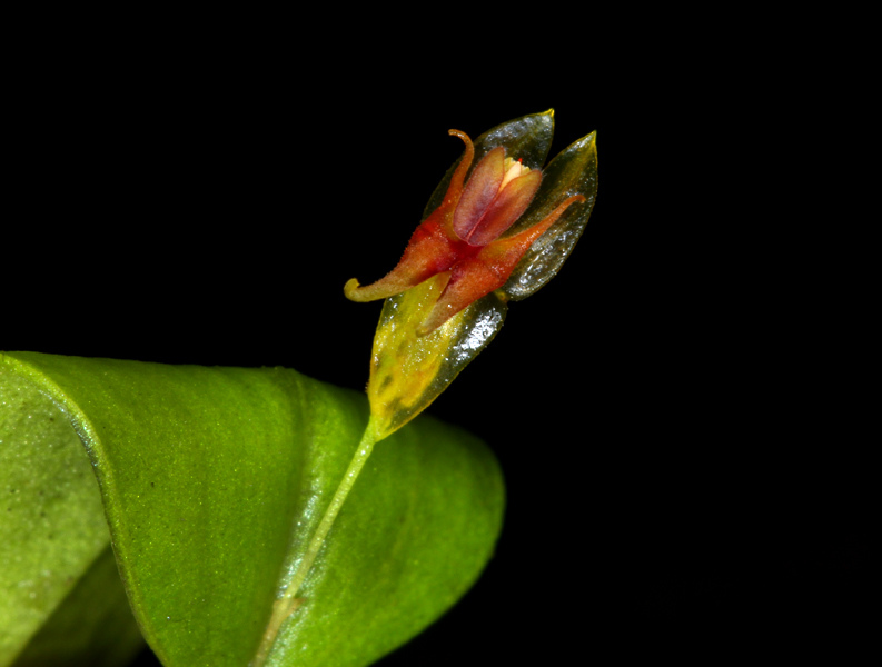 Found in Risaralda department of Colombia at elevations around 2400 meters as a mini-miniature sized, cold growing epiphyte with very slender, suberect to erect, ramicauls enveloped by 10 to 18 microscopically ciliate lepanthiform sheaths and carrying a single, apical, suberect to spreading, thin, ovate, acute to subacute, rounded to cuneate and contracted below into the base leaf that blooms in the later spring on a filiform, very congested, subsecund, to .32 to .56" [8 to 14 mm] long including the .12 to .36" [3 to 9 mm] long peduncle, successively many flowered inflorescence arising on top of the leaf.