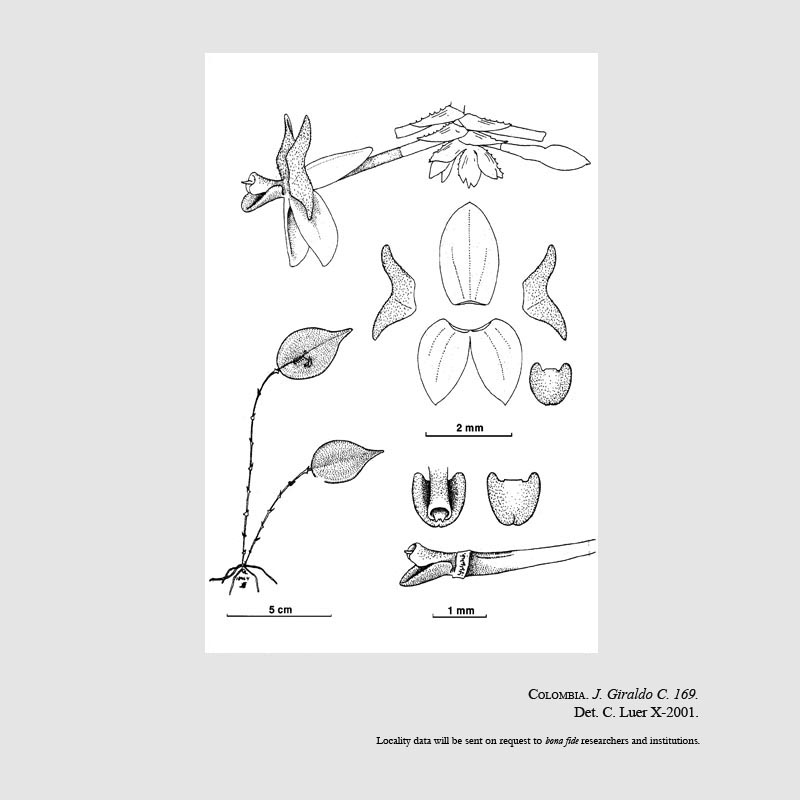 References W3 Tropicos, Kew Monocot list , IPNI ; * Orquideologia Vol 22 #1 2001 Drawing fide; Icones Pleurothallidinarum Vol XXXII Luer 2012 drawing fide; Orchids A Colombian Treasure Vol 3 Ortiz & Uribe 2019 drawing fide;
