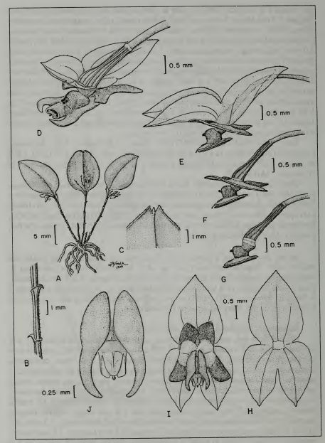 Found in Haiti and the Dominican Republic in primary mossy forests on ravine walls at elevations around 850 meters as a mini-miniature sized, warm growing epiphyte with erect ramicauls enveloped by 3 to 5, ribbed, microscopically echinate lepanthiform sheaths and carrying a single, apical, erect, green-brown above, purple beneath, ovate to sub-orbicular, obtuse, abruptly contracted into the shortly petiolate base leaf that blooms in the spring on 1 to 5, shorter than the leaf, arising on top of the leaf, distichous, congested, adpressed to the leaf, successively single, to 25 flowered inflorescence.