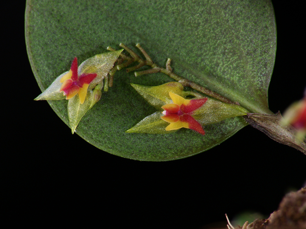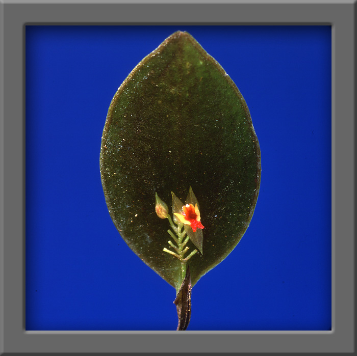 Found in Costa Rica in premontane rain forest to cloud forest and disturbed primary forests at elevations of 1500 to 1800 meters as a mini-miniature sized, cool growing epiphyte with erect, slender ramicauls enveloped completely by 4+ lepanthiform sheaths and carrying a single, apical, erect, coriaceous, elliptic, acute, abruptly narrowing below into the cuneate base leaf that blooms in the spring on a .4" [1 cm] long, successively single, several flowered inflorescence holding the flowers on the back of the leaf.