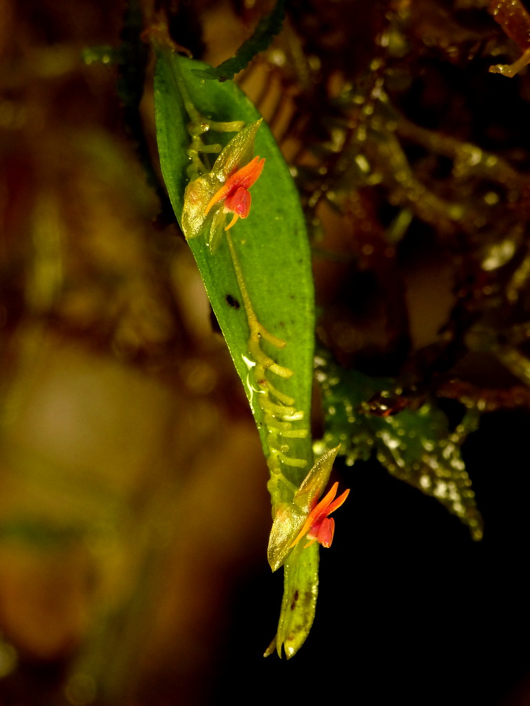 Found in Carchi province of Ecuador at elevations around 2100 meters as a mini-miniature sized, cold growing epiphyte with very slender, erect ramicauls enveloped by 10 to 11, minutely ciliate, lepanthiform sheaths with acuminate ostia and carrying a single, apical, erect, thinly coriaceous, purple suffused, ovate, acute, acuminate, cuneate below into the petiolate base leaf that blooms in the spring on a slender, congested, distichous, 1.2" [3 cm] long, successively many flowered inflorescence arising on the top of the leaf with glaberous floral bracts.