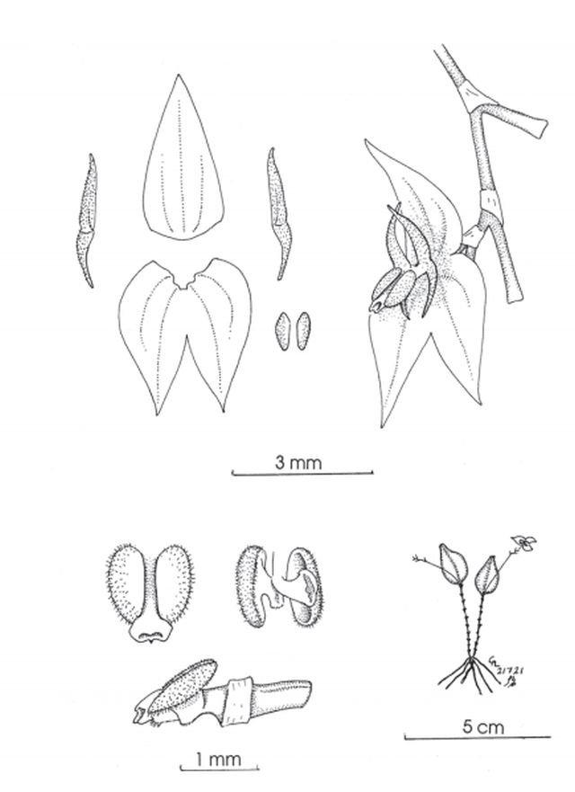 "The ramicauls of this delicate little species are covered with numerous short lepanthiform sheaths. A successively few-flowered raceme equals and surpasses the ovate leaf that is conspicuously tridentate at the tip. The sepals and petals are acute, the lobes of the petals being attenuated. The blades of the lip are convex and pubescent, and the appendix is short and thick." Luer & Larsen 2012