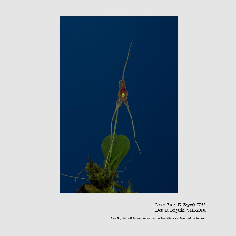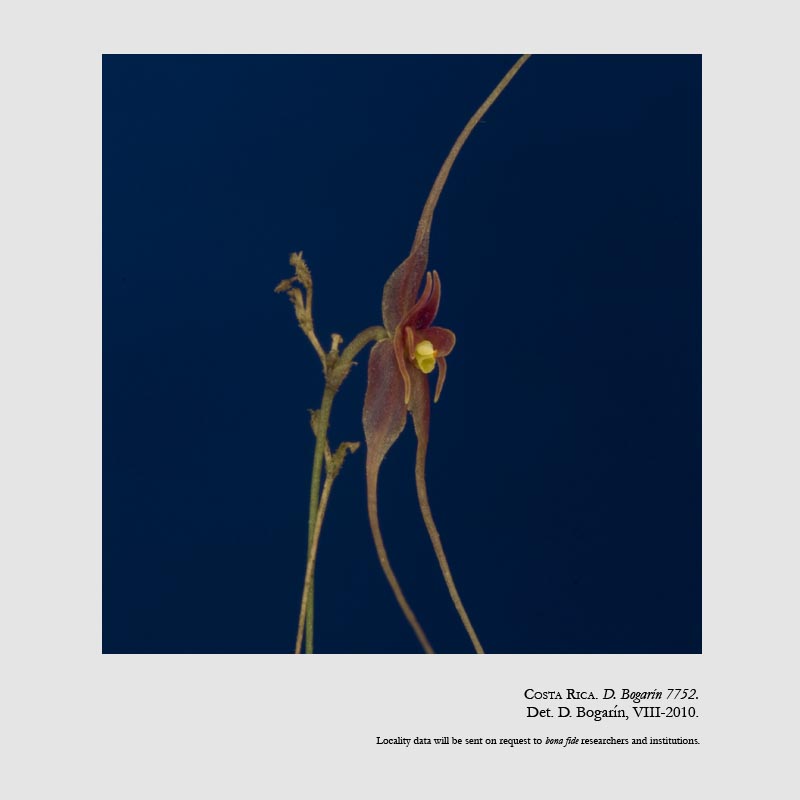 Found in Puntarenas province of Costa Rica in pastures at elevations of 1500 meters as a mini-miniature sized, cool growing epiphyte with slender, erect ramicauls enveloped by 2 to 4, thin, tubular, microscopically ciliate, lepanthiform sheaths and carrying a single, apical, erect, coriaceous, elliptical, margined, obtuse t orounded, cuneateto rounded and contracted below into the petiolate base leaf that blooms in the late winter through early spring on a filiform, congested, .4" [1 cm] long, successively few flowered inflorescence holding the flower near the tip to beyond the leaf.