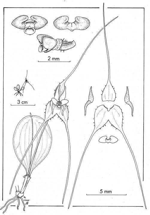 Vegetatively one of the smallest Lepanthes of Central America and carrying a relatively large delicate flower near or just beyonf the apex of the distinctly margines, tiny leaf. The blades of the sepals are small but thel hairlike tails are 4 to 5 times longer. The upper lobes of the petals are obliwuely triangular qand the lower lobes are narrowly falcate.
