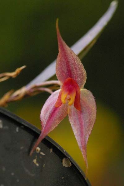 Found in Costa Rica at elevations above 2500 meters as a miniature sized, cold growing epiphyte with erect, ramicauls enveloped by 6 or so lepanthiform sheaths carrying an erect, coriaceous, elliptic, acute, gradually narrows below into the base leaf that blooms in the fall on a 1" [2.5 cm] long, successively single, several flowered inflorescence arising on the back side of the leaf.