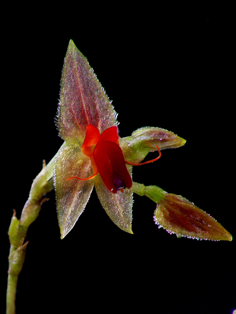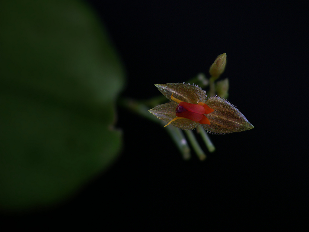 Found in Costa Rica on the Caribbean side of the Cordillera in wet montane forests at elevations around 2100 meters as a mini-miniature sized, cold growing epiphtye with suberect to erect, slender ramicauls enveloped by 6 to 10, slightly dilated apically, lepanthiform sheaths with acute, glabrous ostia and carrying a single, apical, erect, elliptic, acute, thinly subcoriaceous, cuneate below and contracted into the indistinct petiolate base leaf that blooms in the fall on a congesated, distichous, 2" [5 cm] long, successively single, several flowered inflorescence arising on the front of the leaf with a broadly ovate, acuminate, amplectant, sparsely glandular floral bract.