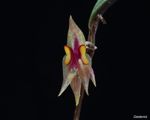 Found in Oaxaca state of Mexico in evergreen cloud forests at elevations of 2300 to 2600 meters as a mini-miniature sized, cold growing epiphyte with erect-ascending ramicauls enveloped by 3 to 5, close, lepanthiform sheaths with dilated, acute ostia and carrying a single, apical, erect, fleshy, rigid, frequently spotted with purple, narrowly elliptical to elliptic-lanceolate, acute, tridenticulate, cuneate below into the petiolate base leaf that blooms in the spring through summer on a thin, congested, .12 to .2" [3 to 5mm] long, successively several flowered inflorescence either on top or beneath the leaf but always shorter than the leaf and can have 1 to 3 flowers open at any one time.