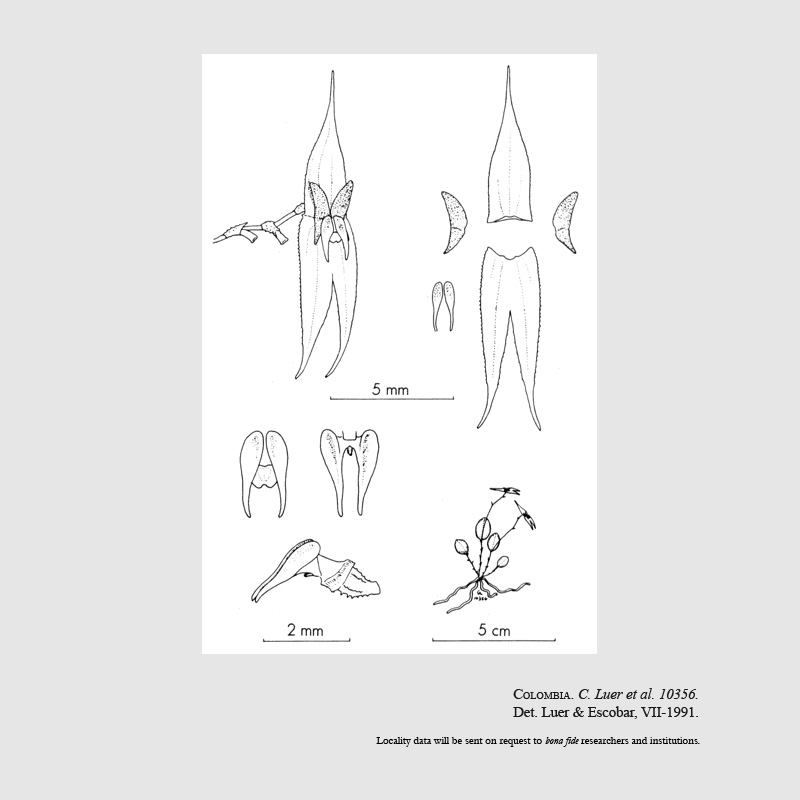 References W3 Tropicos, Kew Monocot list , IPNI ; *Orquideología 18(1): 49. Luer & Escobar 1991 drawing fide; Icones Pleurothallidinarum Vol XXXII Luer 2012 drawing fide; Orchids A Colombian Treasure Vol 3 Ortiz & Uribe 2019 drawing fide;