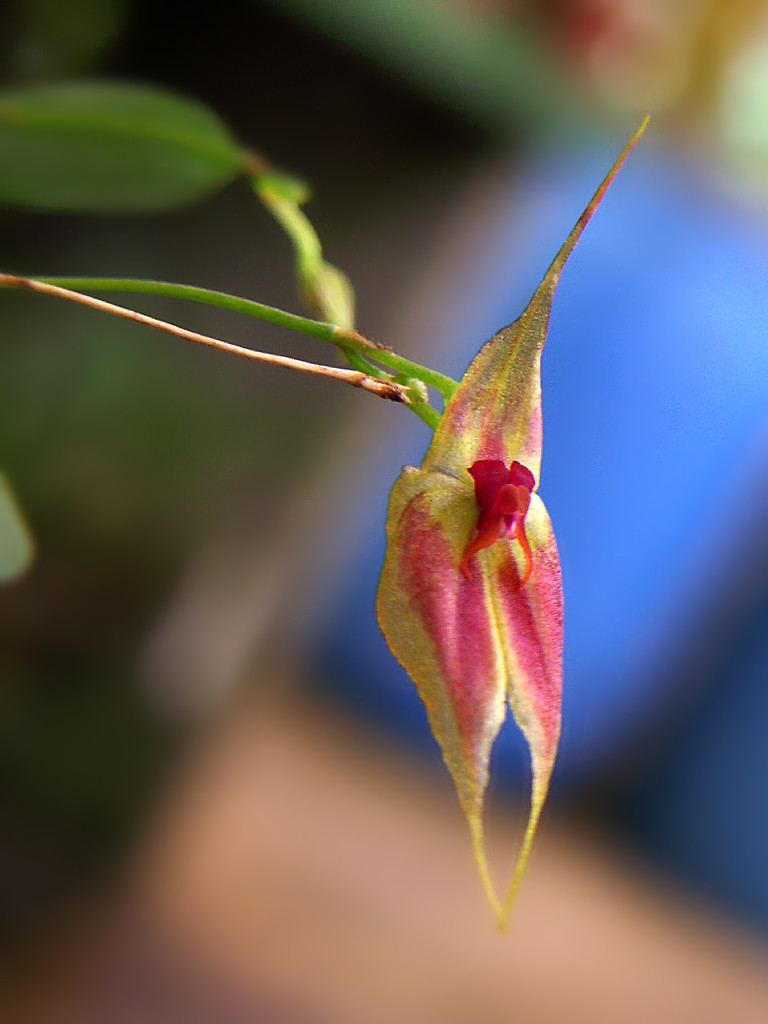 Found in Costa Rica and Nicaragua on twigs in exposed conditions in disturbed tropical wet forest, premontane belt transition on the Caribbean slopes of Cordillera de Guanacaste and Tilarán at elevations of 600 to 1500 meters as a mini-miniature sized, warm to cool growing epiphyte with erect, slender ramicauls enveloped by 2 to 3, minutely scabrous, brown sheaths with rather conspicuous, infundibuliform, hispid ostia and carrying a single, apical, coriaceous, broadly cuneate spatulate to obovate rounded and minutely tridenticulate apically, cuneate narrowing below intothe short, indistinct petioalte base leaf that blooms in the winter on 1 to 2, longer than the leaf, arising behind the leaf, racemose, loose, distichous, peduncle filiform, provided with a small, tubular sheath in the middle, .44 to 1" [1.1 to 2.5 cm] long, rachis fractiflex, successively single, 2 to 5 flowered inflorescence with infundibuliform, glabrous, shroter than the pedicel floral bracts.
