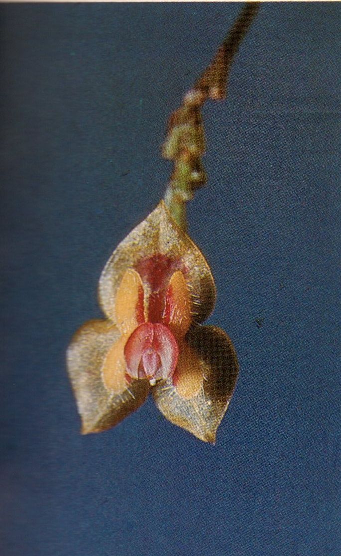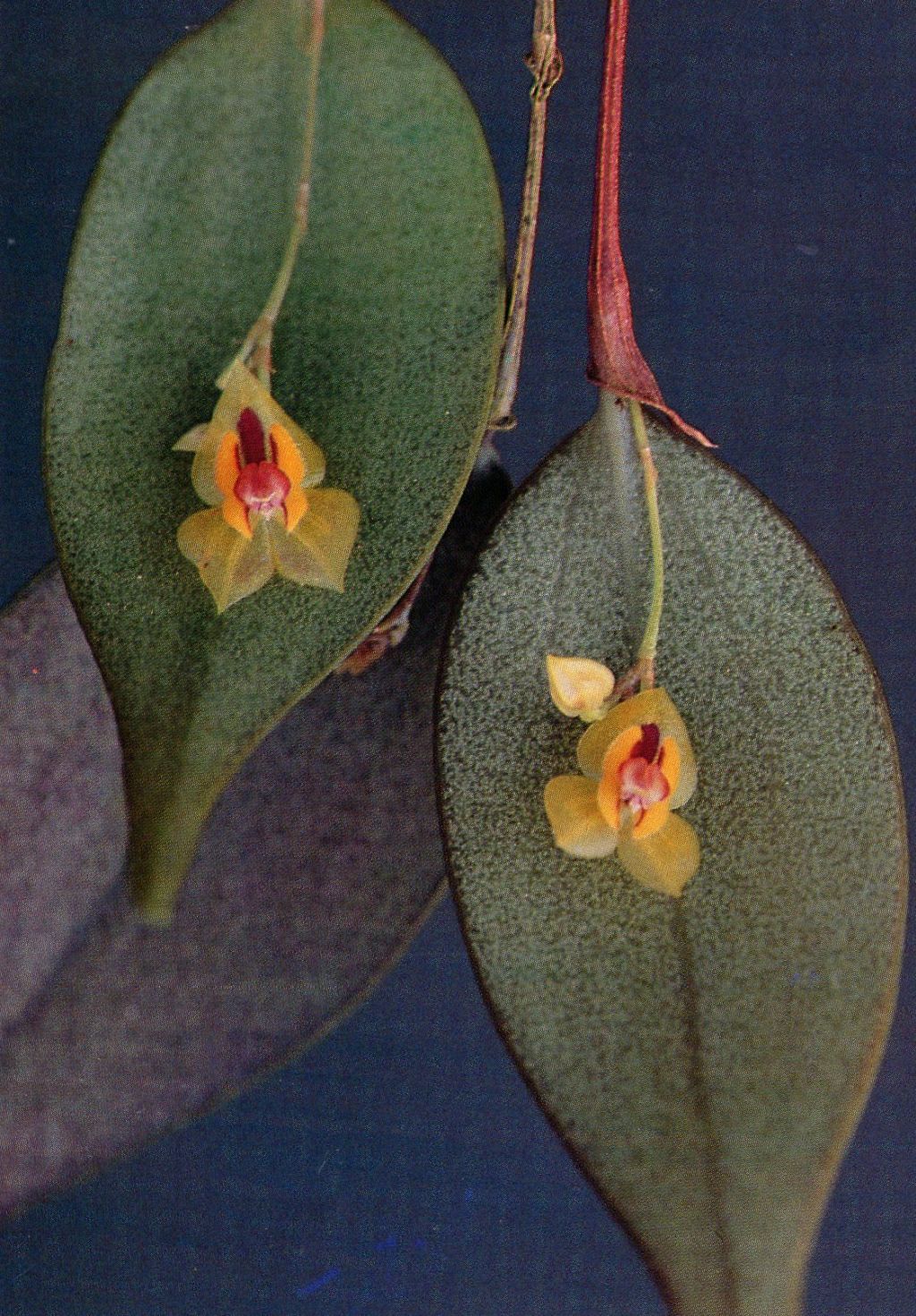 Found in Antioquia department of Colombia in cloud forests at elevations around 2600 meters as a miniature sized, cold growing epiphyte with slender, erect ramicauls enveloped by 4 to 9, close fitting, microscopically scabrous lepanthiform sheaths and carrying a single, apical, erect to spreading, thinly coriaceous, ovate, acute, long-acuminate, rounded and abruptly contracted below into the petiolate base leaf that blooms in the late summer and early fall on a filiform, very congested, distichous, .52 to .64" [1.3 to 1.6 cm] long including the .32 to .4" [8 to 10 mm] long peduncle, successively single, few flowered inflorescence arising on the back of the leaf.