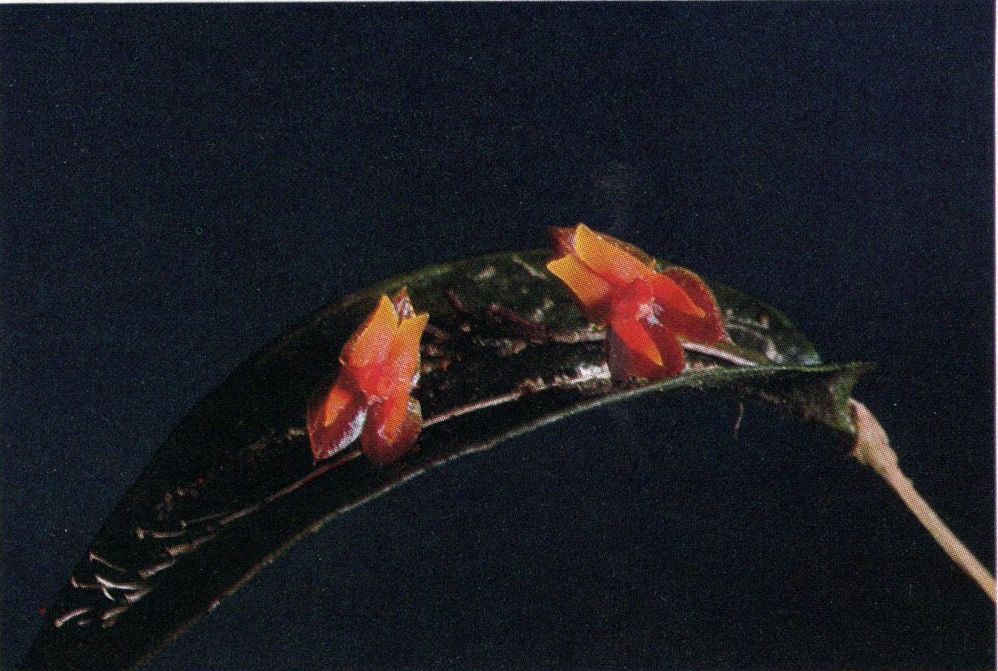 Found in Antioquia department of Colombia in cloud forests at elevations around 2000 meters as a mini-miniature sized, cool to cold growing epiphyte with weak, slender, suberect ramicauls enveloped by 8 to 10 close, minutely scabrous, lepanthiform sheaths and carrying a single apical, suberect to spreading, thinly coriaceous, ovate, acuminate, acute, rounded below into the petiolate base leaf that blooms in the spring on a filiform, congested, distichous, .6" [1.5 cm] long including the .4" [1 cm] long peduncle, successively flowered inflorescence arising on top of the leaf.