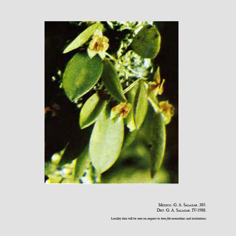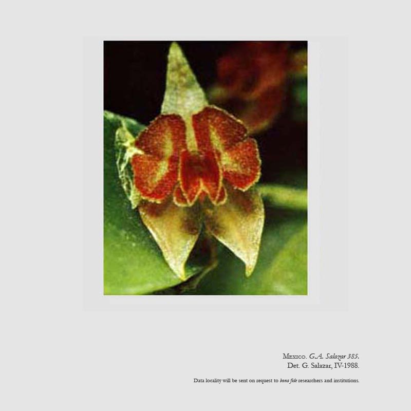 Found in Mexico in wet forests on small branches of small trees at elevations around 1800 to 2500 meters as a mini-miniature sized, cool to cold growing epiphyte with horizontal to pendent, ramicauls enveloped by 3 to 4, yellowish, muriculate, lepanthiform sheaths and carrying a single, apical, coriaceous, slightly fleshy, slightly conduplicate-concave, elliptic to elliptic-obovate, obtuse to acute, tridenticulate, dark green leaf that blooms in the winter, and again in the late spring and summer on 1 to 2, only one with flowers, congested, flexuous, [8mm] long, successively 4 to 12 flowered inflorescence arising on the top of the leaf.