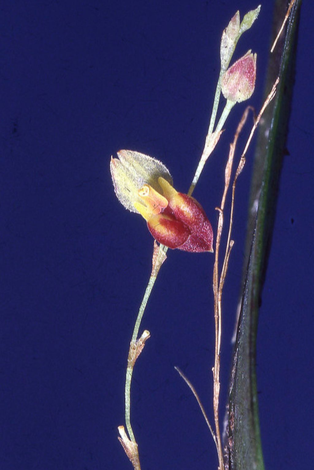 Found in Norte de Santander department of Colombia in cloud forests at elevations around 2000 to 2100 meters as a miniature sized, cool to cold growing epiphyte with slender, erect ramicauls enveloped by 10 to 12, minutely ciliate lepanthiform sheaths and carrying a single, apical, erect, coriaceous, elliptical, acute, acuminate, cuneate below into the petiolate base leaf that blooms in the later spring on 3 to 6, erect, lax, 3 to 3.2" [7.5 to 8 cm] long including the .6 to .8" [1.5 to 2 cm] long peduncle, successively single, few flowered inflorescence.