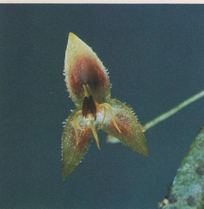 Found in Antioquia department of Colombia at elevations around 2000 to 2100 meters as a mini-miniature sized, cool to cold growing epiphyte with slender, erect ramicauls enveloped by 5 to 8, microscopically scabrous lepanthiform sheaths and carrying a single, apical, suberect, coriaceous, subconduplicate, lanceolate, truncate apex conspicuously tridentate, gradually narrowing below into the base leaf that blooms in the spring on a filiform,congested, secund, .52 to .6" [1.3 to 1.5 cm] long including the .32 to .4" [8 to 10 mm] long peduncle, successively single, few flowered inflorescence arising on top of the leaf.
