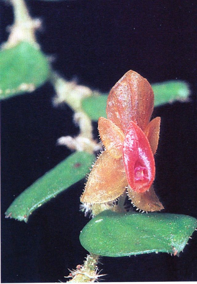 Found in Colombia and Ecuador at elevations of 1800 to 2400 meters as a miniature sized, warm to cool growing epiphytependent occasionally branching, slender rhizome giving rise to a ramicaul enveloped by a single long ciliate lepanthiform sheath with dilated ostia and carrying a single, apical, coriaceous, sparsely ciliate, elliptic to orbicular, obtuse to rounded apically, 3 veined, rounded and abruptly contracted below in to the petiolate base leaf that blooms in the winter and spring on an ascending, .04 to .08" [1 to 2 mm] long, single flowered inflorescence with a spiculate floral bract