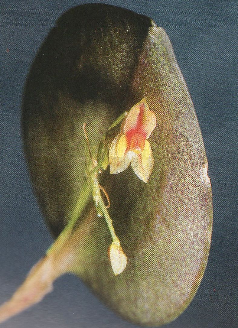 Found in Colombia at elevations of 2200 to 2500 meters as a mini-miniature sized, cold growing epiphyte with erect to suberect, slender ramicauls enveloped by 5 to 6, close, microscopically ciliate lepanthiform sheaths and carrying a single, apical, thickly coriaceous, erect, ovate, subacute, rounded and abruptly contracted below into the petiolate base leaf that blooms in the spring on a filiform, congested, distichous, 1.2" [3 cm] long, successively flowered inflorescence arising on the back the leaf