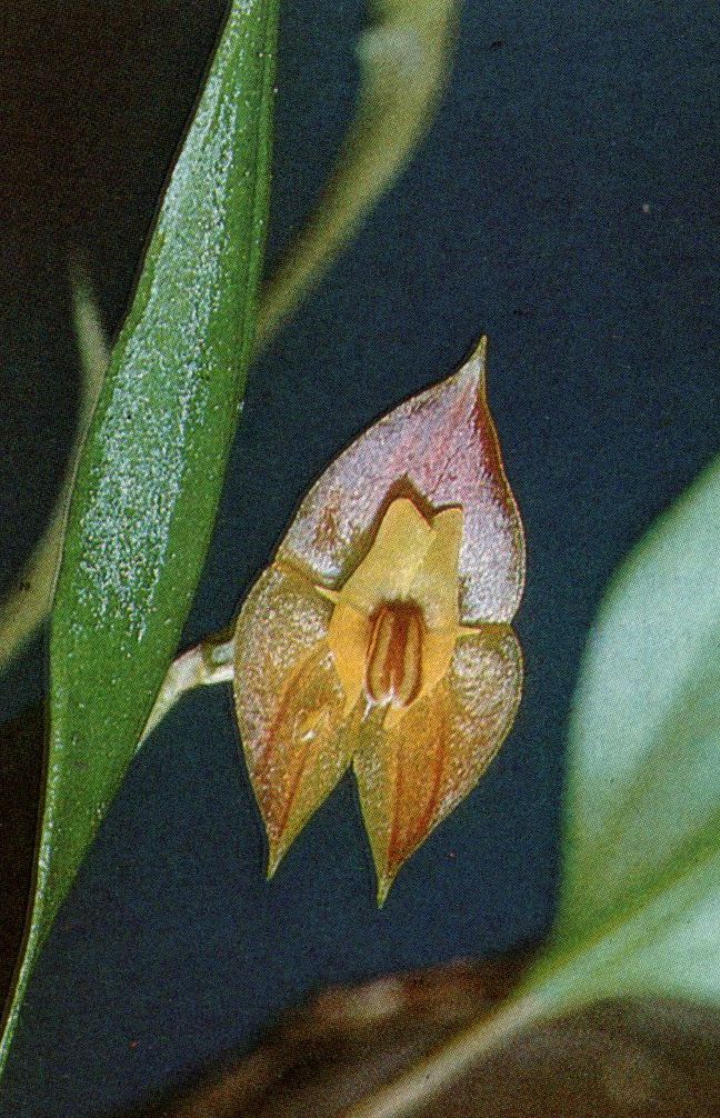 Found in Antioquia department of Colombia at elevations around 2800 meters as a miniature to small sized, cold growing epiphyte with slender, erect, more or less arching ramicauls enveloped by 10 to 17, minutely scabrous lepanthiform sheaths and carrying a single, apical, suberect to spreading, thinly coriaceous, purple suffused beneath, elliptical-ovate, acute, long-acuminate, cuneate to rounded below into the petiolate base leaf that blooms in the fall through later spring on a filiform, congested, 1.6 to 2" [4 to 5 cm] long including the 1.2 to 1.6" [3 to 4 mm] long peduncle, successively single, many flowered inflorescence arising on top of the leaf.