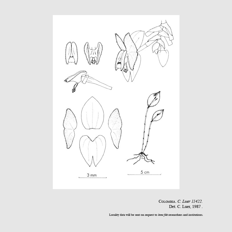 References W3 Tropicos, Kew Monocot list , IPNI ; * Orchideen 38(2): 58. Luer 1987 drawing fide; Icones Pleurothallidinarum Vol XXXII Luer 2012 drawing fide; Orchids A Colombian Treasure Vol 3 Ortiz & Uribe 2019 drawing/photo fide;