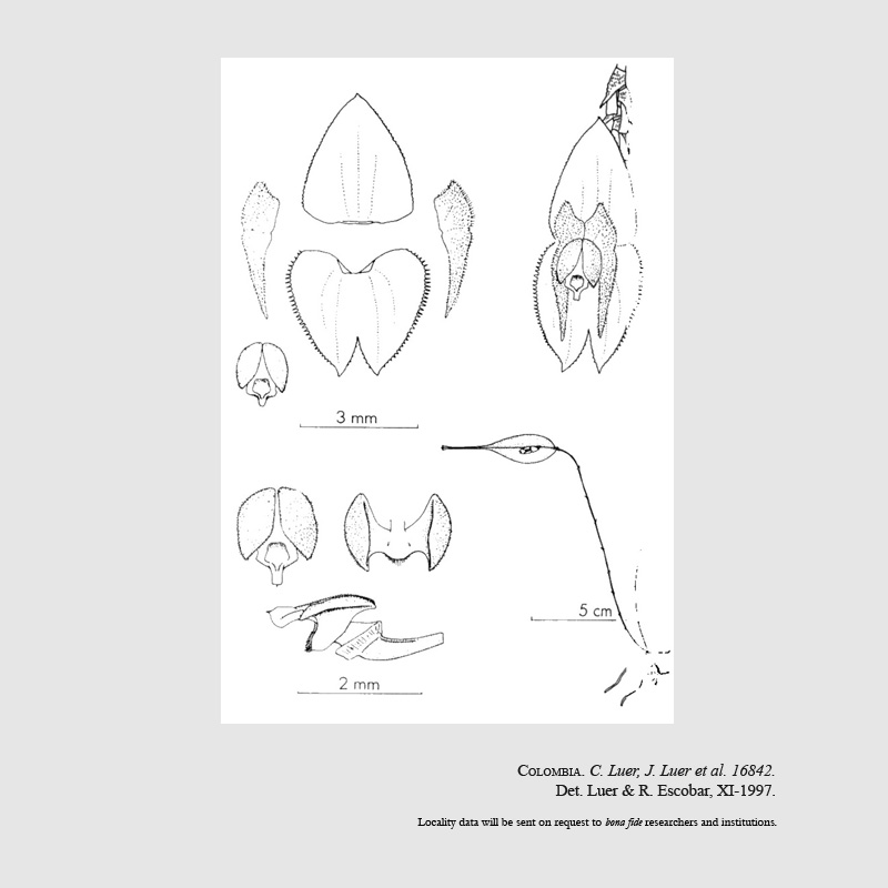 References W3 Tropicos, Kew Monocot list , IPNI ; *Orquideologia Vol 20 #3 pg 299 Luer & Escobar 1997 drawing fide; Icones Pleurothallidinarum Vol XXXII Luer 2012 drawing fide; Orchids A Colombian Treasure Vol 3 Ortiz & Uribe 2019 drawing/photo fide;