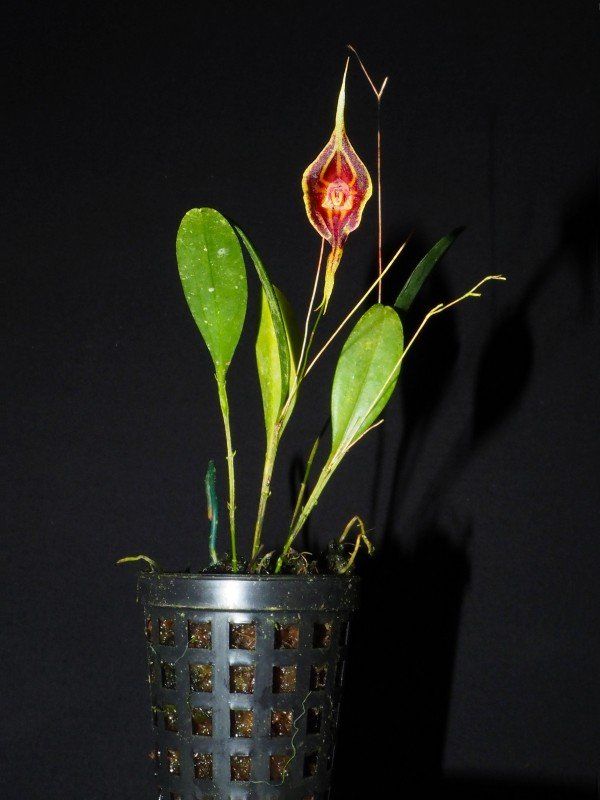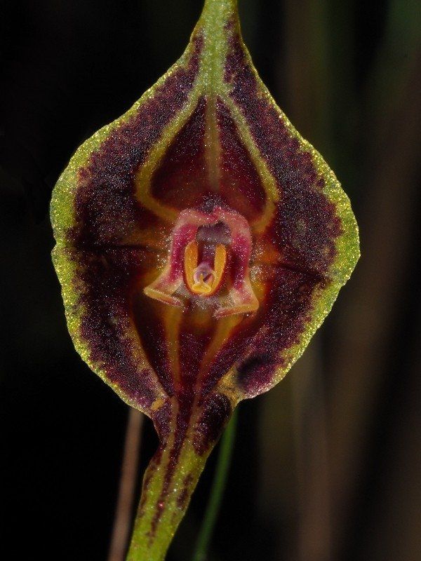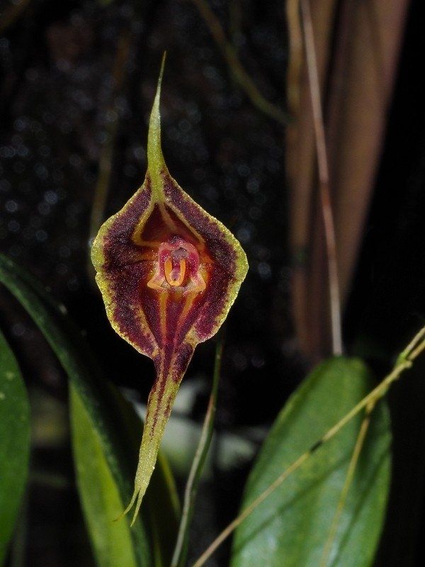 Found in Huanuco department of Peru at higher elevations as a mini-miniature sized, cool to cold growing epiphyte with slender, more or less erect stems enveloped by 4 to 6 minutely scabrous, lepanthiform sheaths with dilated ostia with acuminate apices carrying a single, erect, coriaceous, elliptic, minutely triapiculate apex, cuneate below into the petioalte base leaf that blooms in the late summer and fall on an erect, longer than the leaf, peduncle 1.6 to 2.6" [4 to 6.5 cm] long, to 3.6" [9 cm] long, overall, rachis fractiflex, lax, successively single, to at least 10 flowered inflorescence with minutely verrucose, acuminate, shorter than the ovary floral bracts.