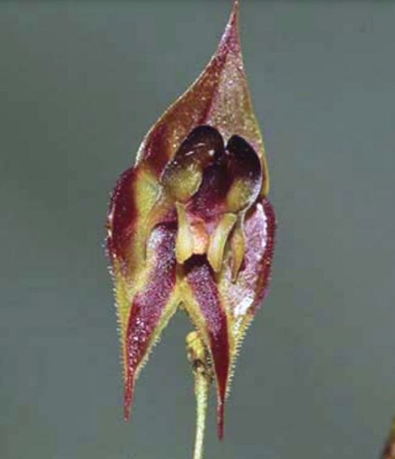 Found in Cochabamba department of Bolivia in forests at elevations around 1750 meters as a super-mini-miniature sized [less than 1/2" tall total], cool growing epiphyte with slender, erect ramicauls enveloped by 2, microscopically pubescent lepanthiform sheaths and carrying a single, apical, erect, coriaceous, elliptical, subacute to obtuse, cuneate below into the petiolate base leaf that blooms in the early summer on a congested, distichous, .28" [7 mm] long, successively single, 2 flowered inflorescence with minutely ciliate floral bracts.