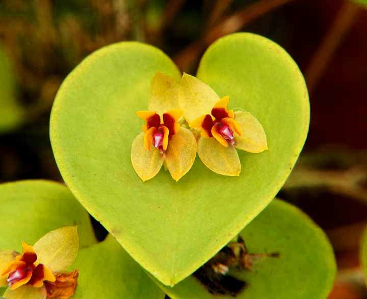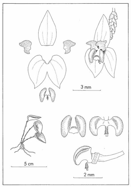 "The stiff leaves are cordate and concave, the little flowers being borne on top of the leaf near the base within the concavity, the petals are irregularily bilobed, the oblong blades of the lip do not cover the column and the appendix is a narrowly oblong, pubescent organ with a small apical segment." Luer 1987
