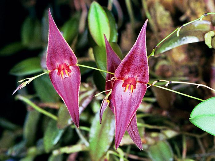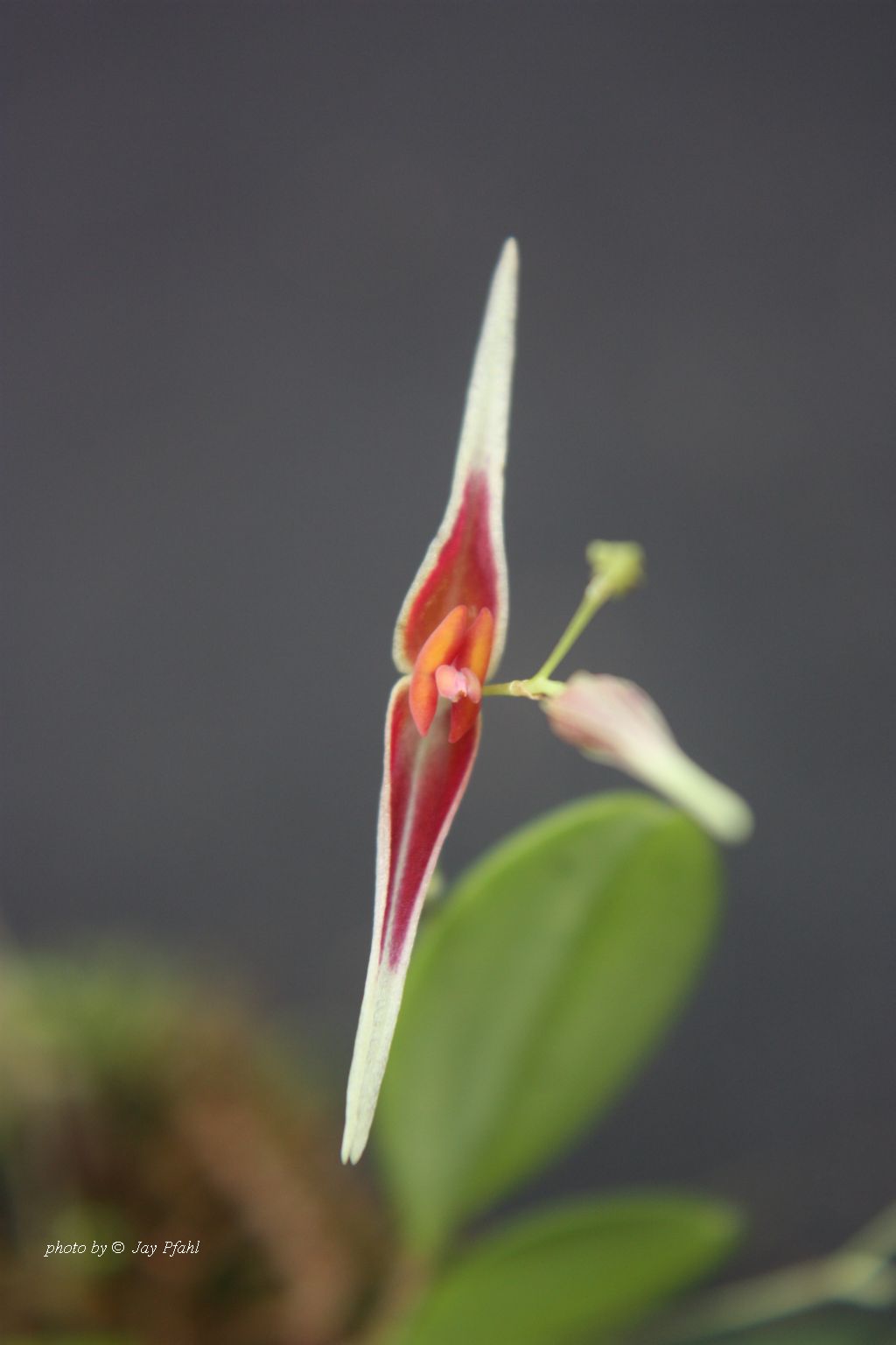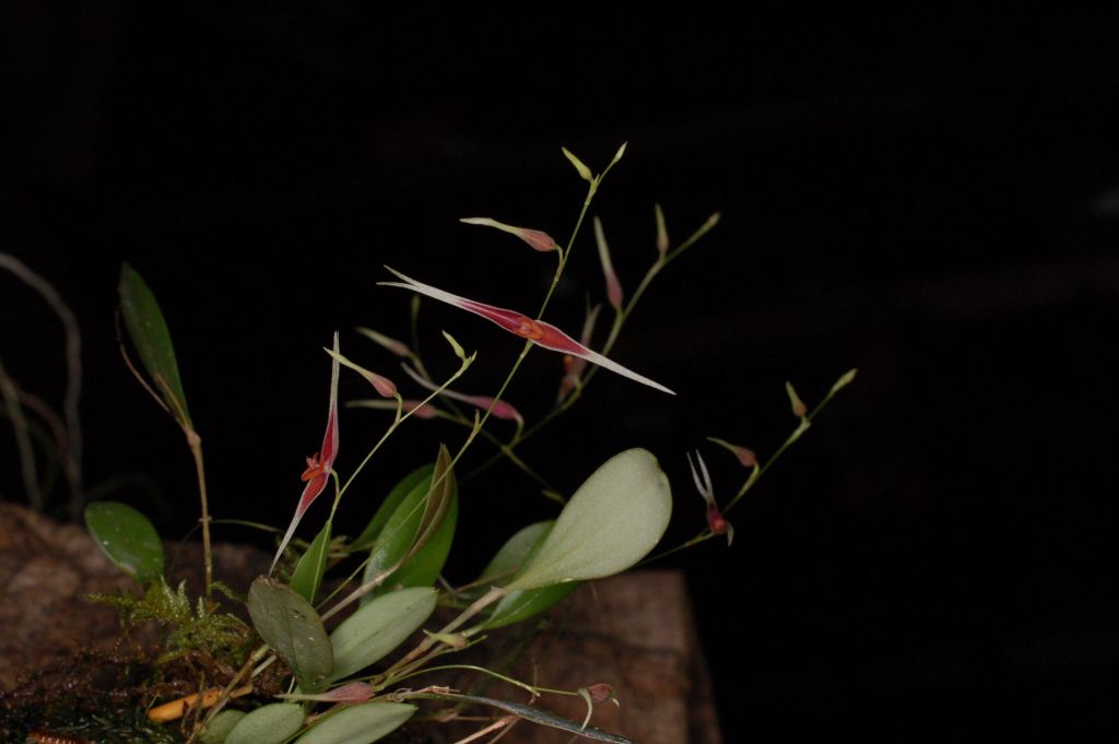 Found in Venezuela, Colombia and Bolivia at 2400 to 2500 meters in dense forests as a miniature, cold growing epiphyte with ramicauls enveloped basally by 6 tubular, lepanthiform sheaths carrying oval leaves with clasping bases, and bidentate apex and blooms in the spring on an erect, 3 3/5" [9 cm] long, successively few flowered inflorescence arising from the apex of the ramicaul and having acuminate floral bracts.