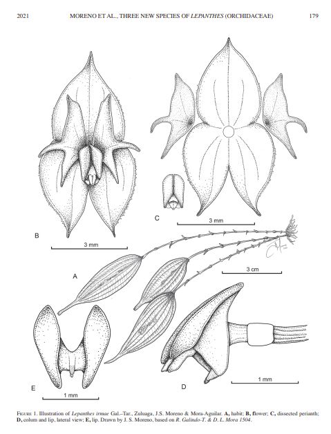 References W3 Tropicos, Kew Monocot list , IPNI ; * Harvard Papers in Botany, Vol. 26, No. 1, pp. 177–188 Gal.–Tar., Zuluaga, J.S. Moreno & Mora-Aguilar 2021, THREE NEW SPECIES OF LEPANTHES (ORCHIDACEAE: PLEUROTHALLIDINAE) FROM SAN JOSÉ DEL SALADO, VALLE DEL CAUCA, IN SOUTHWESTERN COLOMBIA drawing/ photo fide