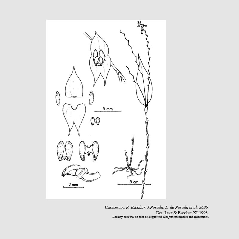 References W3 Tropicos, Kew Monocot list , IPNI ; * Orquideologia 19(1): 28-29 Luer & Escobar 1993 drawing fide; Native Colombian Orchids VOl 5 COS 1994 photo fide; Icones Pleurothallidinarum Vol XXXII Luer 2012 drawing fide; Orchids A Colombian Treasure Vol 3 Ortiz & Uribe 2019 photo fide;