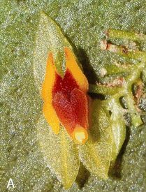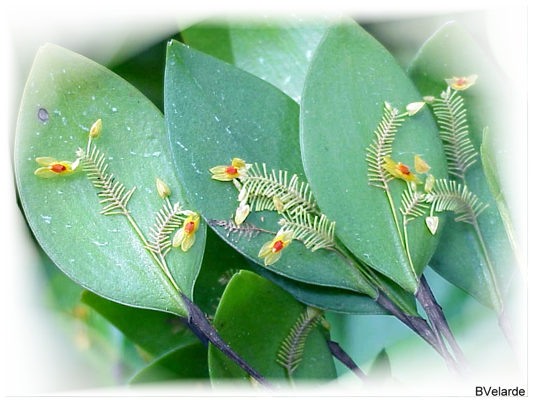 Found in Guatemala at elevations around 600 meters as a miniature sized, hot to warm growing epiphyte with erect ramicauls enveloped by 4 to 9, adpressed, minutely glandular-pubescent lepanthiform sheaths and carrying a single, apical, erect, coriaceous, subconcave, elliptic, acute, tridentate apically, cuneate below into the petiolate base leaf that blooms on a congested, distichous, .8 to 1.2" [2 to 3 cm] long including the .092" [2.3 mm] long peduncle, successively single, several flowered inflorescence arising on the back side of the leaf.