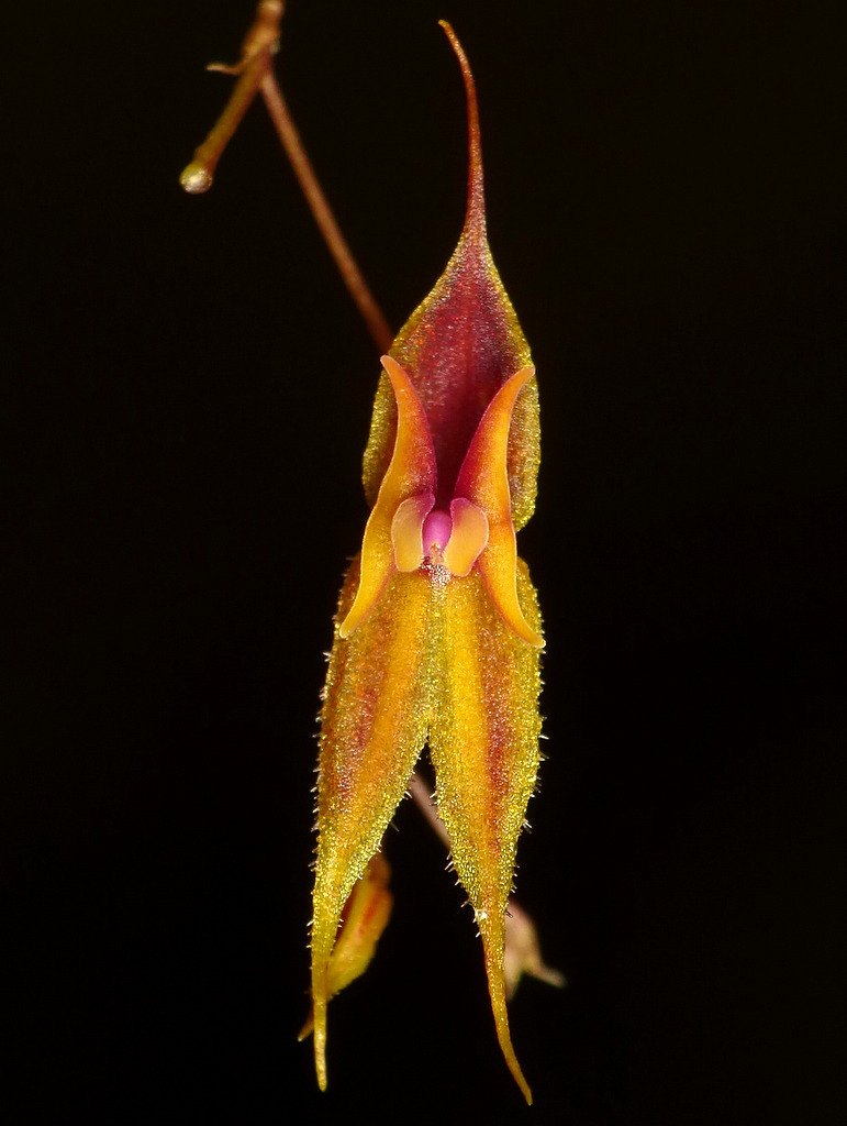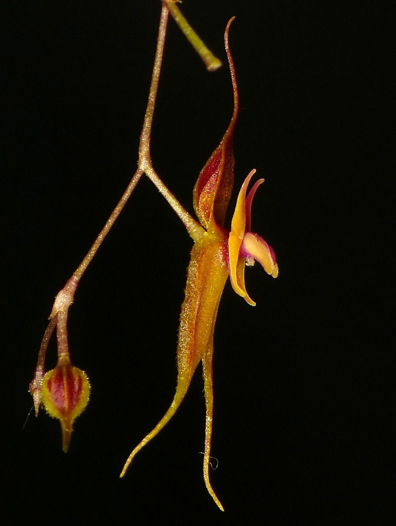 "Distinguished by the fewer, loose, lepanthiform sheaths, obovate leaves, long-caudate sepals, convex blades of the lip with short connectives and an ovois, pubescent appendix." Luer 1996