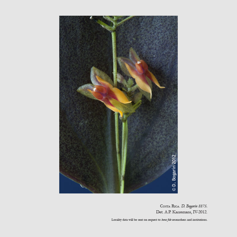 Found in Cartago province of Costa Rica in primary forests and in very wet premontane forests at elevations around 1450 meters as a small sized, cool growing epiphyte with erect to suberect, stems enveloped completely by 8 to 11 minutely ciliate, blackish leapanthiform sheaths and carrying subcoriaceous, green above purple beneath, elliptic to narrowly ovate, acute to acuminate, with an apiculus, cuneate and narrowing below into tthe petiolate base leaf that blooms in the late spring through mid fall on racemose, distichous, arising beneath the leaf, shorter than the leaf, to 1.8" [4.5 cm] long, overall, peduncle to .8" [2 cm] long, rachis to 1" [2.5 cm] long, successively single, several flowered inflorescence with a ciliate, ovate, acuminate, conduplicate, membraneous, muriculate floral bract.