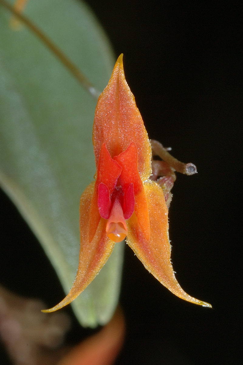 "Characterized by the red and yellow flowers with denticullate, shortly caudate sepals that are borne in short racemes on top of an ovate, shortly acuminate leaf. The upper lobes of the sepals are obliquely truncate with the outer corner elongated. The lobes of the lip are cuneate and spreading to either side of the column. The outer, truncate margin is thickened as rudimentary blades. The appendix is comparitvely large, ovoid and long-pubescent." Luer 1996