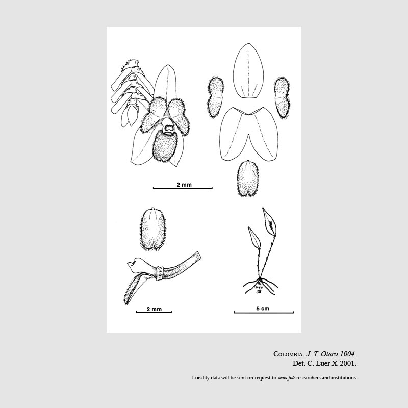 References W3 Tropicos, Kew Monocot list , IPNI ; *Orquideología Vol 22 #1 pg 38-42 Luer 2001 Drawing fide; Icones Pleurothallidinarum Vol XXXII Luer 2012 drawing fide; Orchids A Colombian Treasure Vol 3 Ortiz & Uribe 2019 drawing fide;