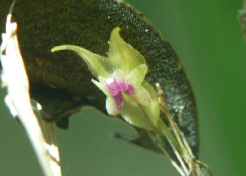 Found in northeastern Colombia and northwestern Venezuela in cloud forests at elevations of 2500 to 2850 meters as a mini-miniature sized, cold growing epiphyte with erect, ramicauls enveloped basally by 5 to 7, lepanthiform sheaths and carrying a single, apical, erect, coriaceous, ovoid, purple flecked, attenuate, minutely tridenticulate apically leaf that blooms in the later spring on a few, slender, erect, congested, distichous, 1 to 1.8" [ 2.5 to 4.5 cm] long including the .2 to .8" [5 to 20 mm] long peduncle, successively single many flowered inflorescence arising on the back of the leaf.